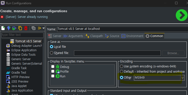Encoding의 Other 부분에 MS949를 입력해주면 된다.